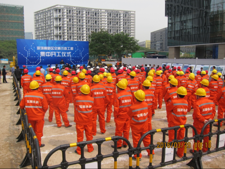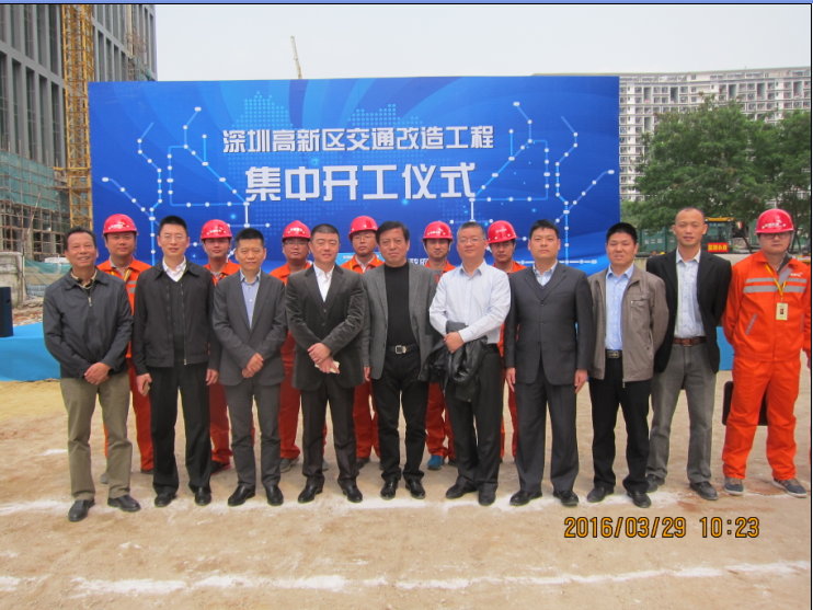 2016年3月29日上午10点,深圳高新区交通改造工程集中开工仪式举行,深圳市委常委杨洪、南山区委书记姜建军、区长王强等市区领导及相关职能部门出席,天健集团市政工程总公司作为参建单位参加开工仪式。