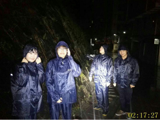 8月2日凌晨2:10分玉龙片区疾风劲雨,全体工作人员通宵达旦,实时了解关注台风情况并与街道、社区工作站人员紧密联系,互通情况。片区值班巡查机动小组冒雨到7栋空楼处及危险边坡进行探查,其中两名女同志冲锋在前,巾帼不让须眉,在关键时刻展现了天健职工的风采。