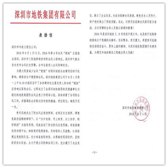 8月4日,深圳市地铁集团有限公司正式向市政总发函:感谢在台风“妮妲”来临之际,天健隧道公司迅速成立了防台风应急指挥部,在胡正东总指挥、谭楚良副总指挥的带领下,迅速启动了防台防汛应急预案,有效搭建信息沟通平台,细致做好隐患排查,及时组织人员疏散,认真组织应急抢险队伍,充分准备抢险物质,合理做好现场防护,坚持抓好安全巡查,全力开展台风防御各项工作,充分履行了国有企业的责任。