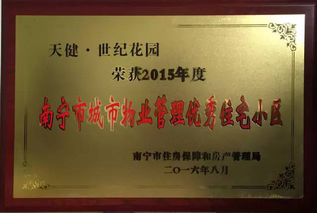 2016年8月,南宁·天健世纪花园(以下简称世纪花园)成功通过创优考评,摘取“南宁市城市物业管理优秀住宅小区”称号。