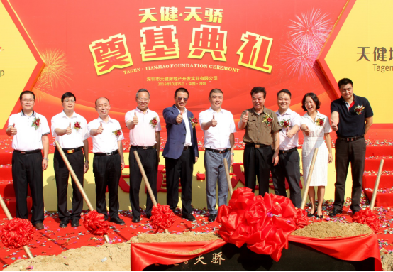 金秋十月,丹桂飘香。2016年10月15日上午,景田片区首个城市更新项目——天健·天骄项目隆重举行开工奠基典礼。福田区副区长刘家宝、福田区城市更新办局长谢晖晖、福田区住建局局长刘军、市规土委福田管理局副局长须宛明、福田区教育局副局长王玉玺、莲花街道办事处副书记张旺、房地产协会会长吕晋川,天健集团董事长辛杰、总经理宋扬、党委副书记童庆火为项目培土奠基。