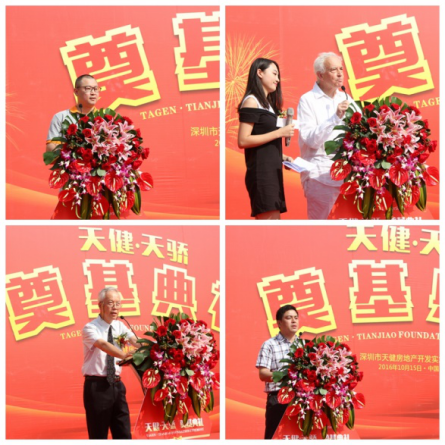 天健集团总经理宋扬在致辞中对各方的支持和帮助表示衷心感谢。他说,天健的成长始于景田片区,对这片土地饱含深情,天健将以高度社会责任感、打造高品质社区来回馈社会。天健地产(深圳)公司总经理李文成、天健建筑公司总经理罗诚、法国欧博建筑与城市规划设计公司董事、设计总监Michel Perisse、阿特金斯顾问(深圳)有限公司高级设计董事张国言分别致辞。他们表示将鼎力合作,共同将天健?天骄项目打造成天健地产划时代之作,提升城市品质和片区价值。