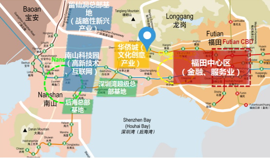 天健科技大厦项目位于深圳南山区北环大道与深云西二路交汇处,为城市核心区域。项目位于的龙珠-侨城文化创意产业带,将以华侨城文化创意产业集聚区为核心,强化对周边区域的辐射效应,进一步聚集创意科技、创意文化产业,构筑文化创意产业带。