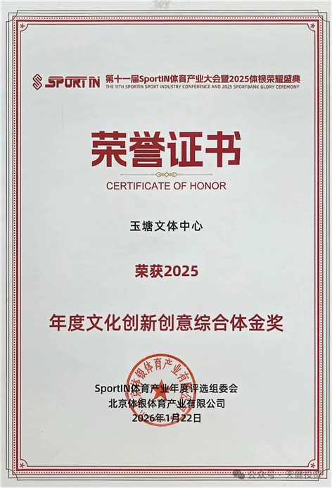 1月22日,第十一届SPORTIN体育产业大会暨2025体银荣耀盛典在北京国家奥林匹克体育中心举行,天健集团投资运营的玉塘文体中心荣获“年度文化创新创意综合体金奖”。